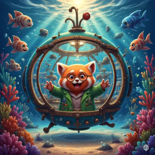 Professor Pip peering out the circular window of a whimsical, mini-submarine, observing colorful coral and friendly deep-sea creatures.
