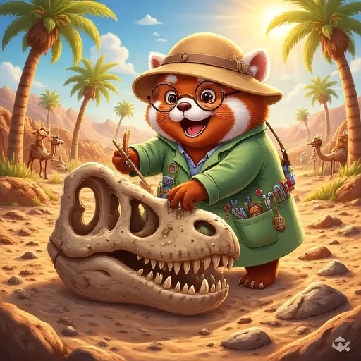 Professor Pip carefully brushing dust off a large, exposed dinosaur bone (like a femur or skull) at a sunny, sandy dig site, using a tiny brush and wearing a wide-brimmed safari hat over his lab coat.