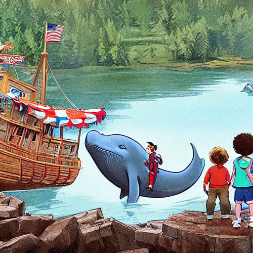 The children ran to the water's edge, amazed by the giant talking whale. Wilbur smiled and said, "Hop on my back, and I'll take you on a journey through time to learn about the history of Maine."